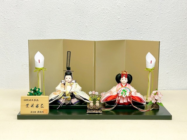 華悦作 柳小 尾長鶏牡丹唐草 親王飾り 小さなお雛様ですが座っている姿勢、左右対称のバランスの良さ、仕事が丁寧な質の良いお雛様です。 お衣装は京都・誉勘商店(こんかんしょうてん)の金襴を使用、絹織物ならではの上質で美しいお着物です。 小道具も大切な役割をしておりお殿様の冠は紗貼り仕様、腰には石帯を締め魚帯を下げています。 お姫様は塗り扇を持たせて高級感のあるお飾りに仕上げています。 屏風は京唐紙を使用した梅丸文様の三曲屏風 雪洞はプラスチック製品、LEDライト、電池式、コードレスタイプ 桜橘は手作りのつまみ細工 ※特典品 人形専用保存剤、白手袋、毛ばたき、クロス、雛人形の飾り方しおり 親王、屏風、飾台、親王台、雪洞、桜橘、毛氈一式お届けします。 ------------------------------------------------------- 【飾り寸法】 (飾った状態の一番長い所を測っています) 幅:約50cm 奥:約25cm 高:約20cm ※ご希望の方にはのし紙をお付けしますので備考欄よりお知らせ下さい。 「御祝」「初節句御祝」「御結婚御祝」などお祝いの名目と贈り主様のお名前をお知らせください。 ------------------------------------------------------- 山田華悦 昭和46年千葉生まれ 平成24年 日本人形協会認定の節句人形工芸士に任命 平成25年 千葉県指定伝統工芸品に指定 千葉県の工房で作られているお雛様です ------------------------------------------------------- 誉勘商店(こんかんしょうてん) 京都・室町の地にて270年 江戸時代より技法と伝統を守り続け、職人さんの手から紡ぎ出される金襴は上質で美しく独創的な世界観があります ------------------------------------------------------- 職人さんが心を込めて作られたお雛様が より一層輝き素敵に見えるように… そしてお客様に喜んで飾っていただけるように… 心がけてこだわってセットしています。 なかなか写真では伝わらない難しい所もありますので わからないことや疑問に思う事はお気軽にお尋ね下さい。 ------------------------------------------------------- ■裁断の場所によってお着物の柄の位置が変わります。 ご了承の程宜しくお願いします。 ■画像の発色には、気をつけていますが若干風合いが濃くなったり薄くなって要る場合があります。 ご了承頂けますようにお願いいたします。 ■到着しましたら箱に入っている状態を写真に撮っておかれるとお片付けする時に悩まず便利だと思います。 ■湿気に弱いため防虫剤を入れてできれば風通しの良い所に保管して下さい。 ⚠️離島にお住まいの方は送料2800円も一緒に選択お願いします(別途送料がかかります) 雛人形 雛祭り 桃の節句 親王飾り お内裏様 初節句 お祝い コンパクト シンプル インテリア