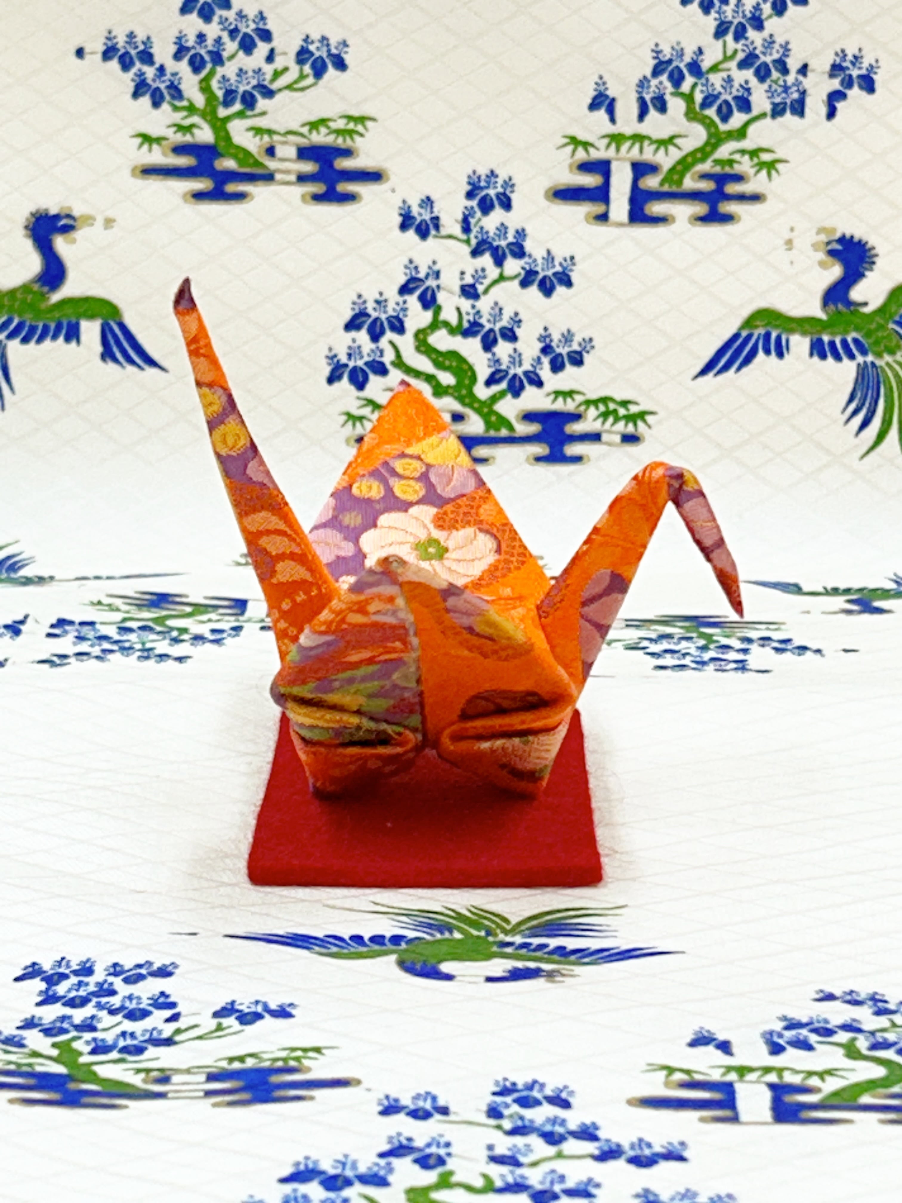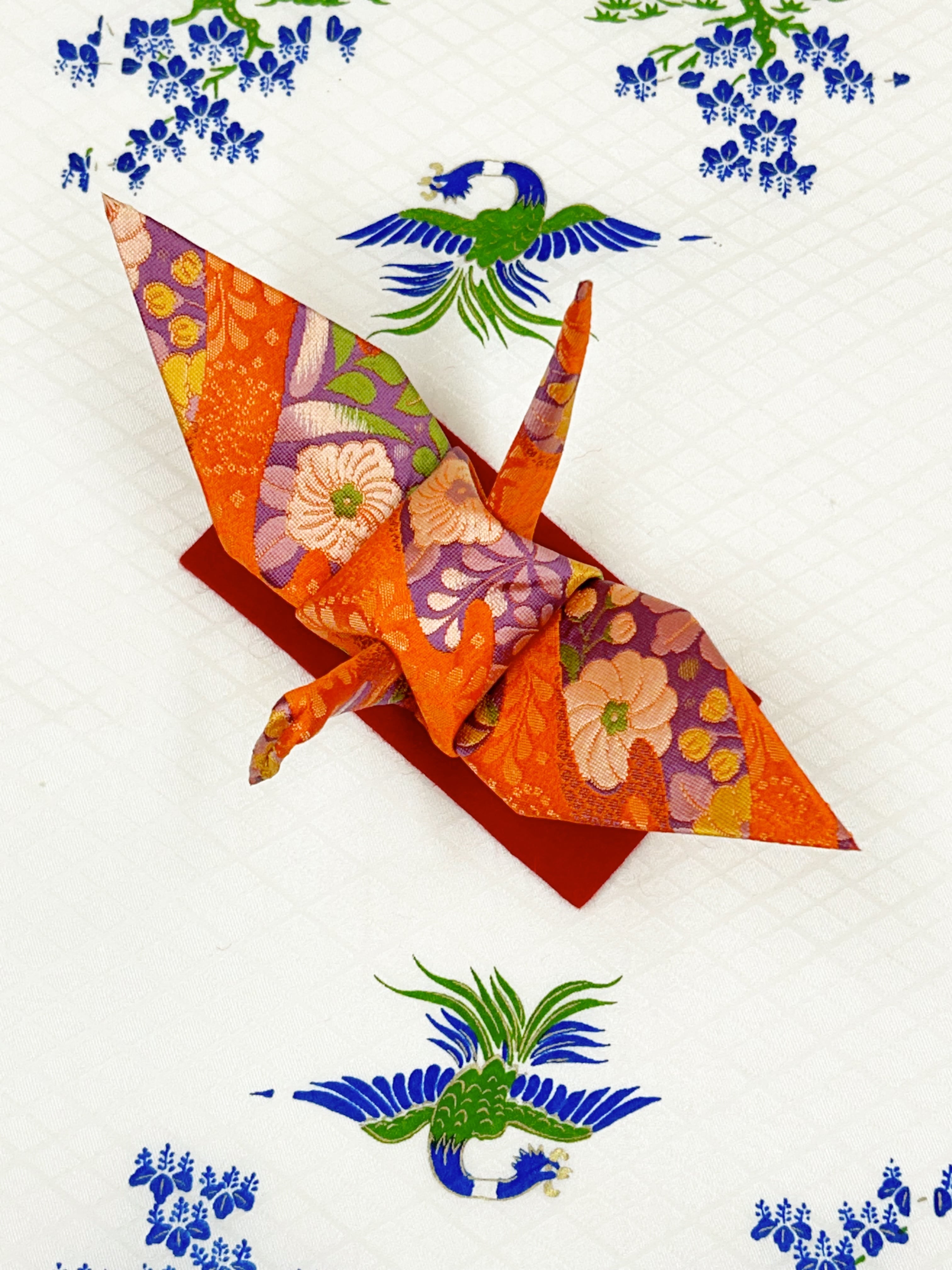 朱色生地一面に四季折々の草花模様が華やかな折り鶴です。