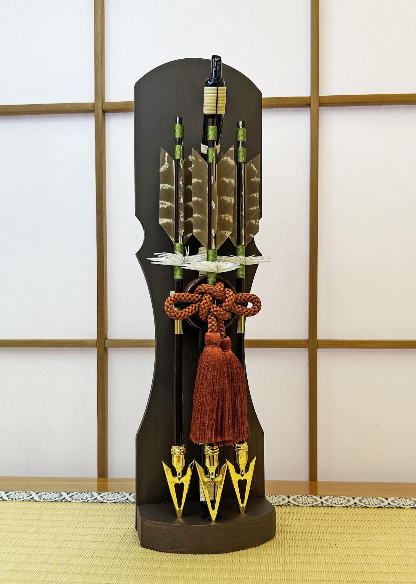 置き飾りまたは壁掛け飾りとして使って頂ける2wayタイプの破魔弓飾りです。