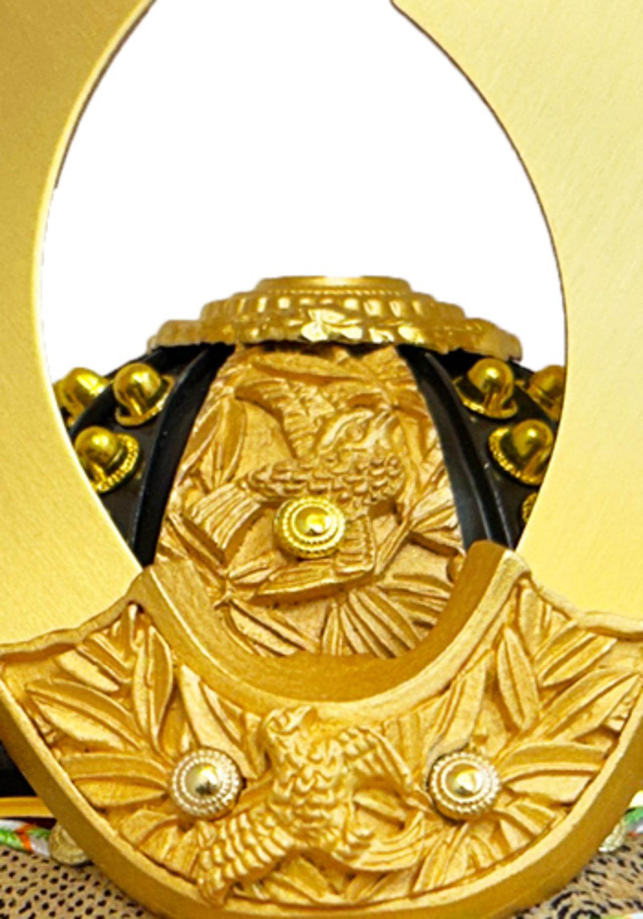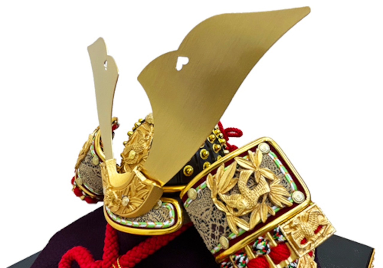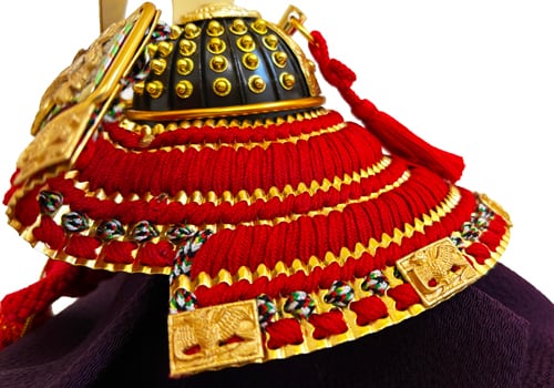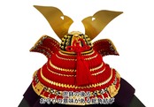 迫力があるがある大きな鍬形(くわがた)、純金箔押しの小札板に赤糸縅が映える豪華な兜飾りです。