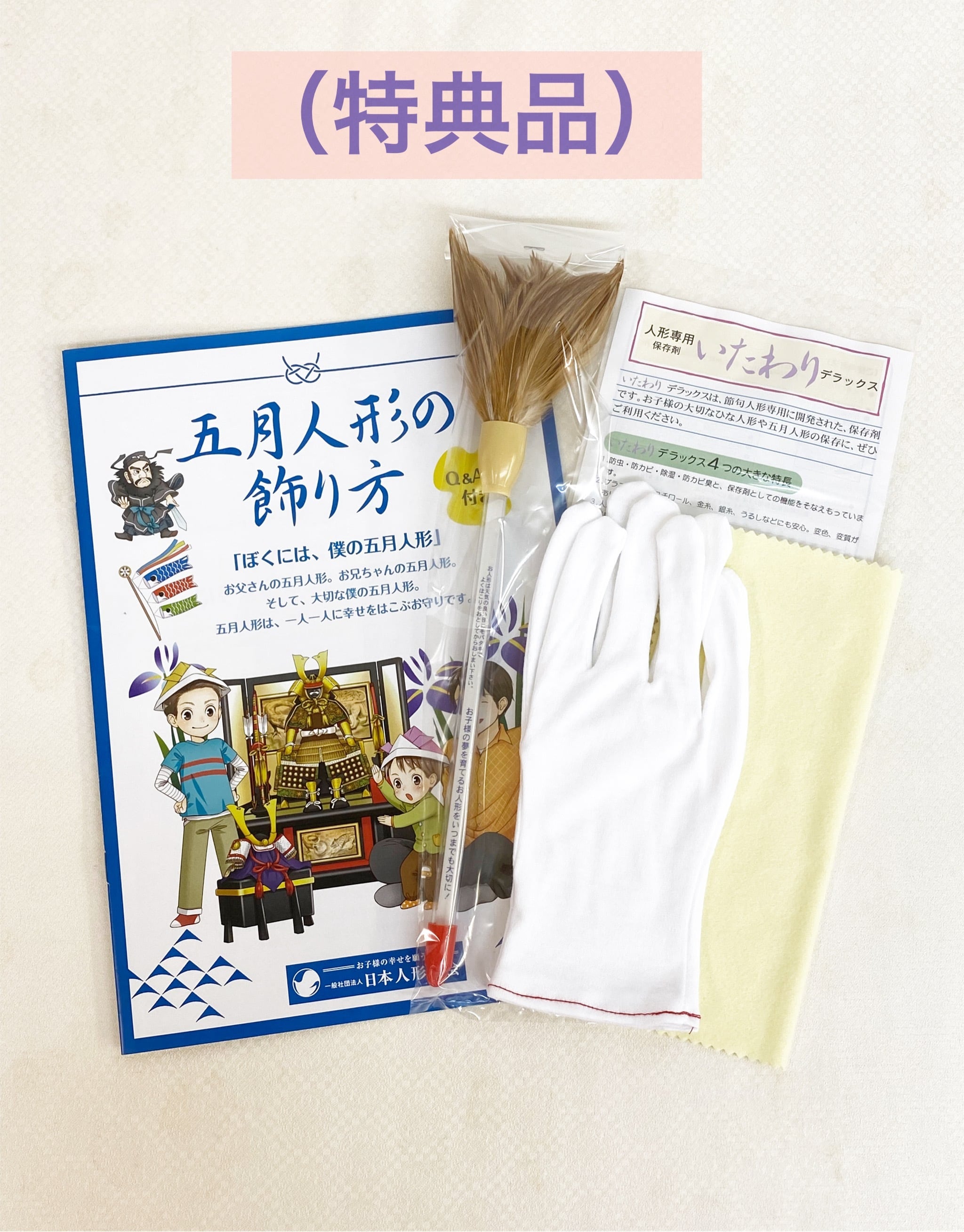 人形専用保存剤、白手袋、毛ばたき、クロス、五月人形の飾り方しおり、毛氈