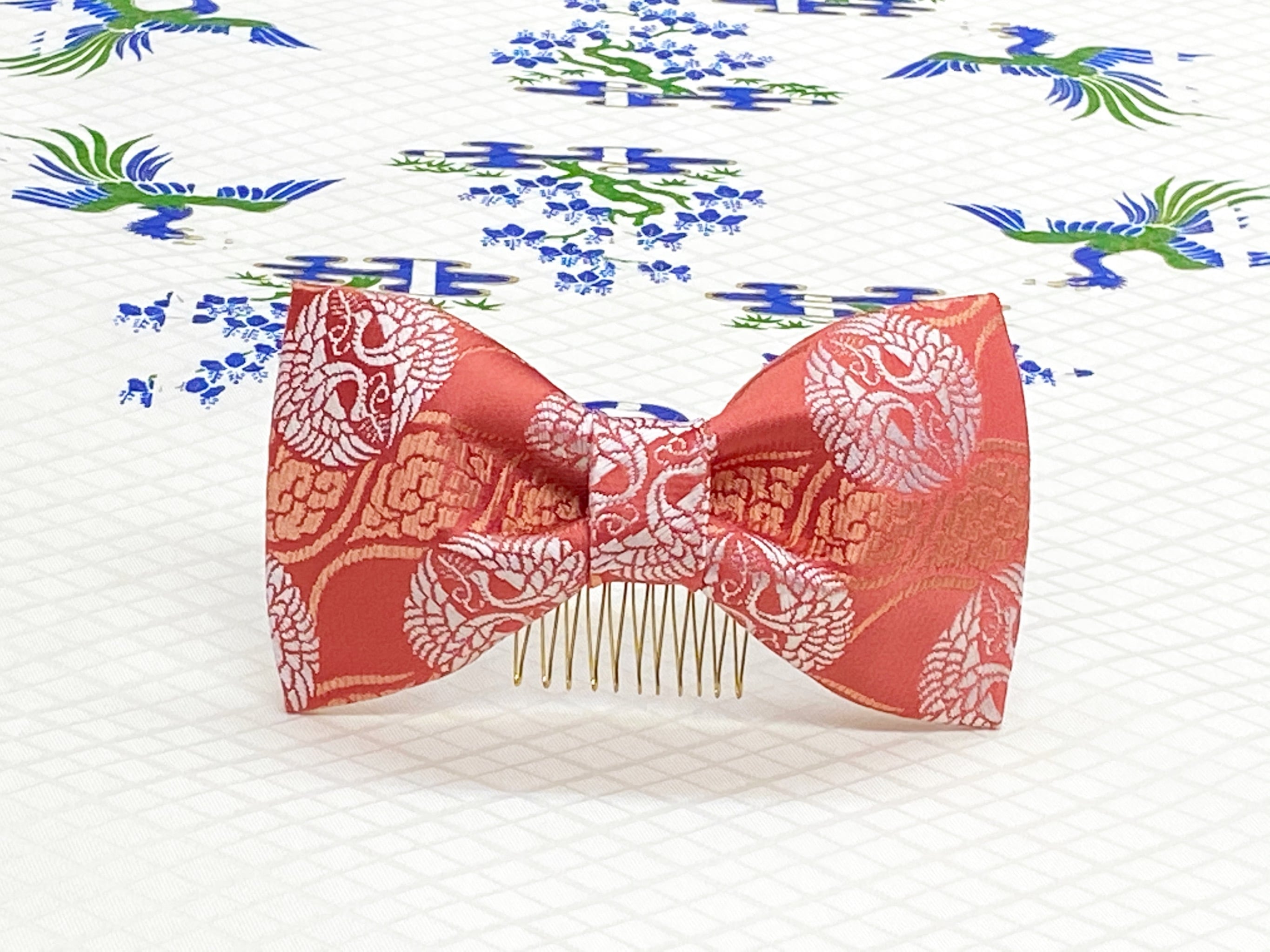和風リボン○髪飾り○向かい鶴文様○ピンク色○m-1 成人式 七五三 結婚式 卒業式 お茶会(送料無料)