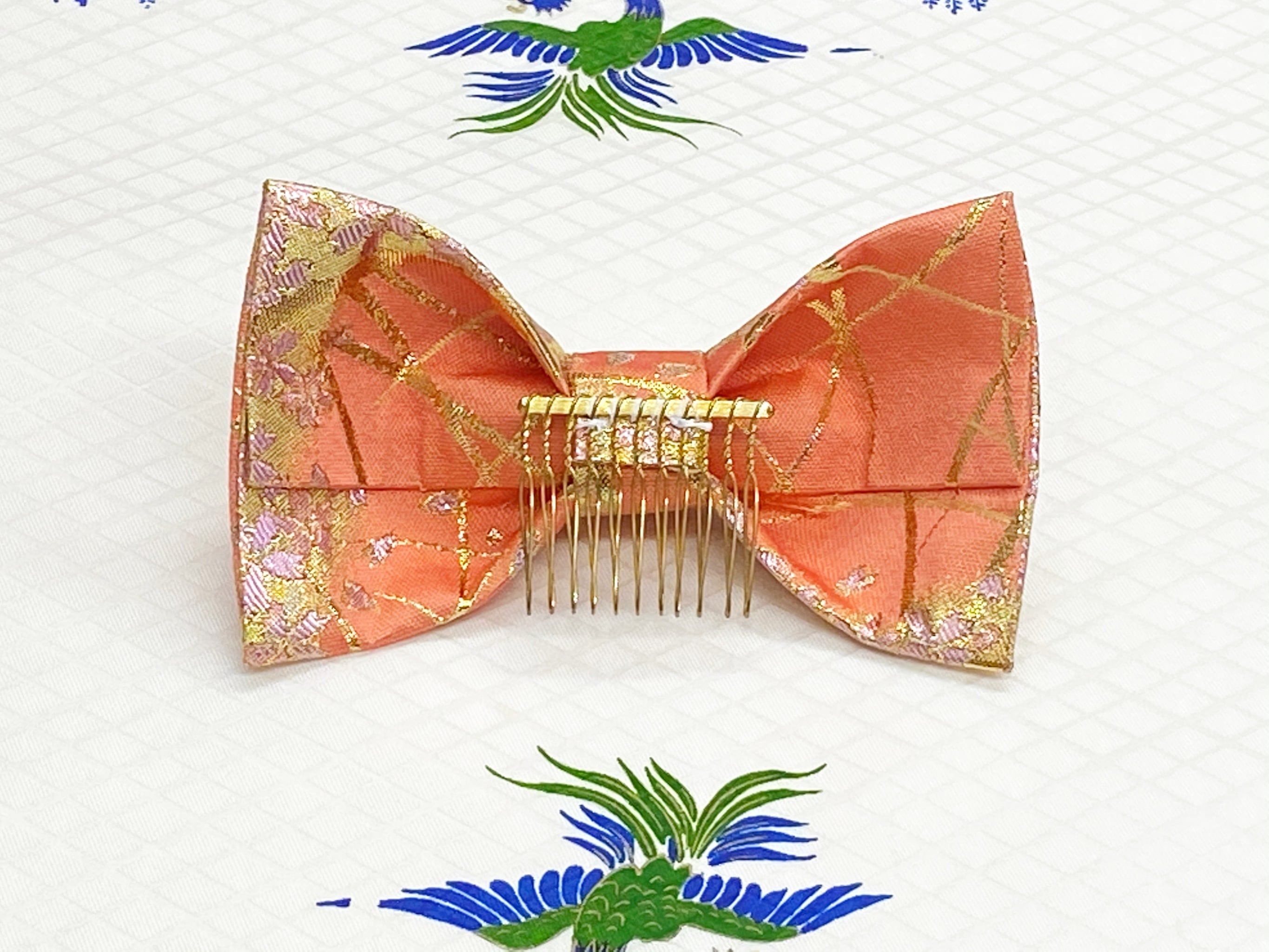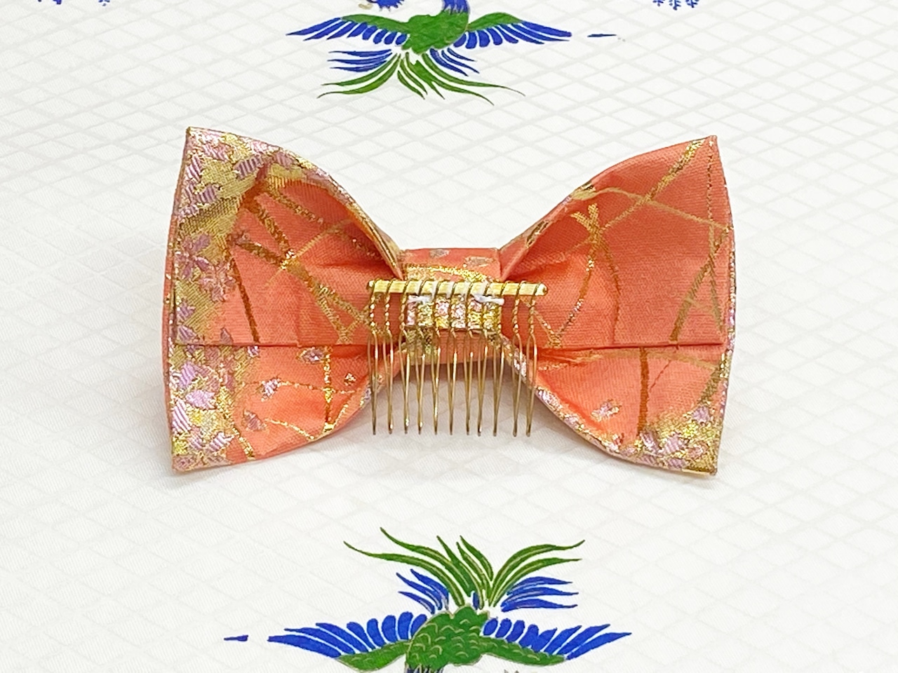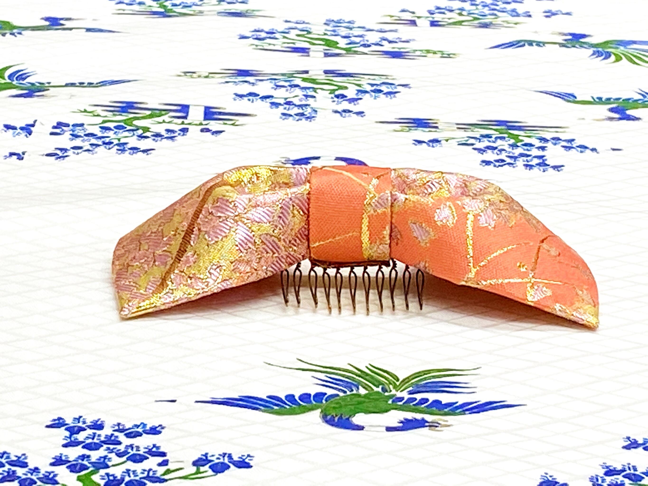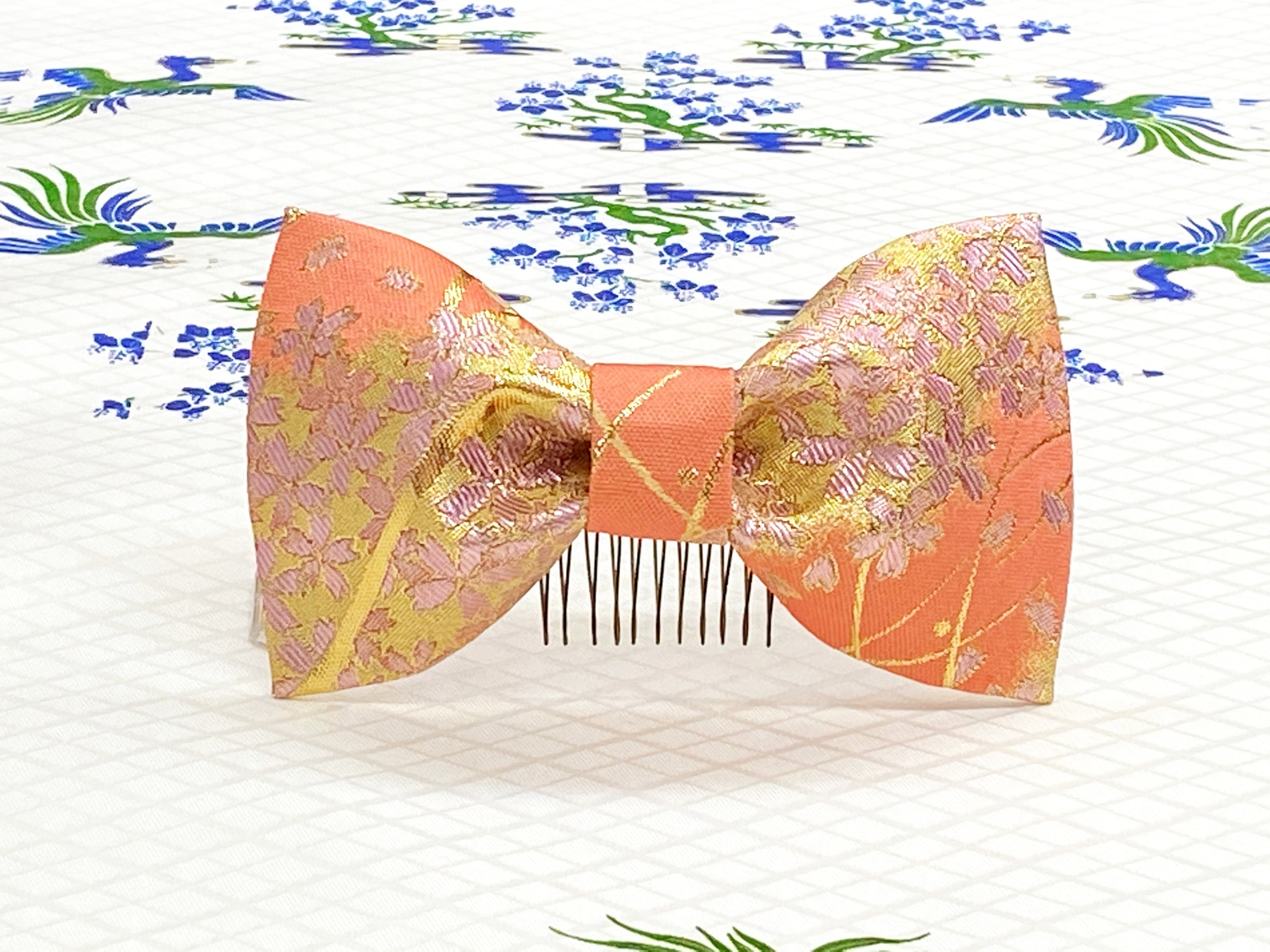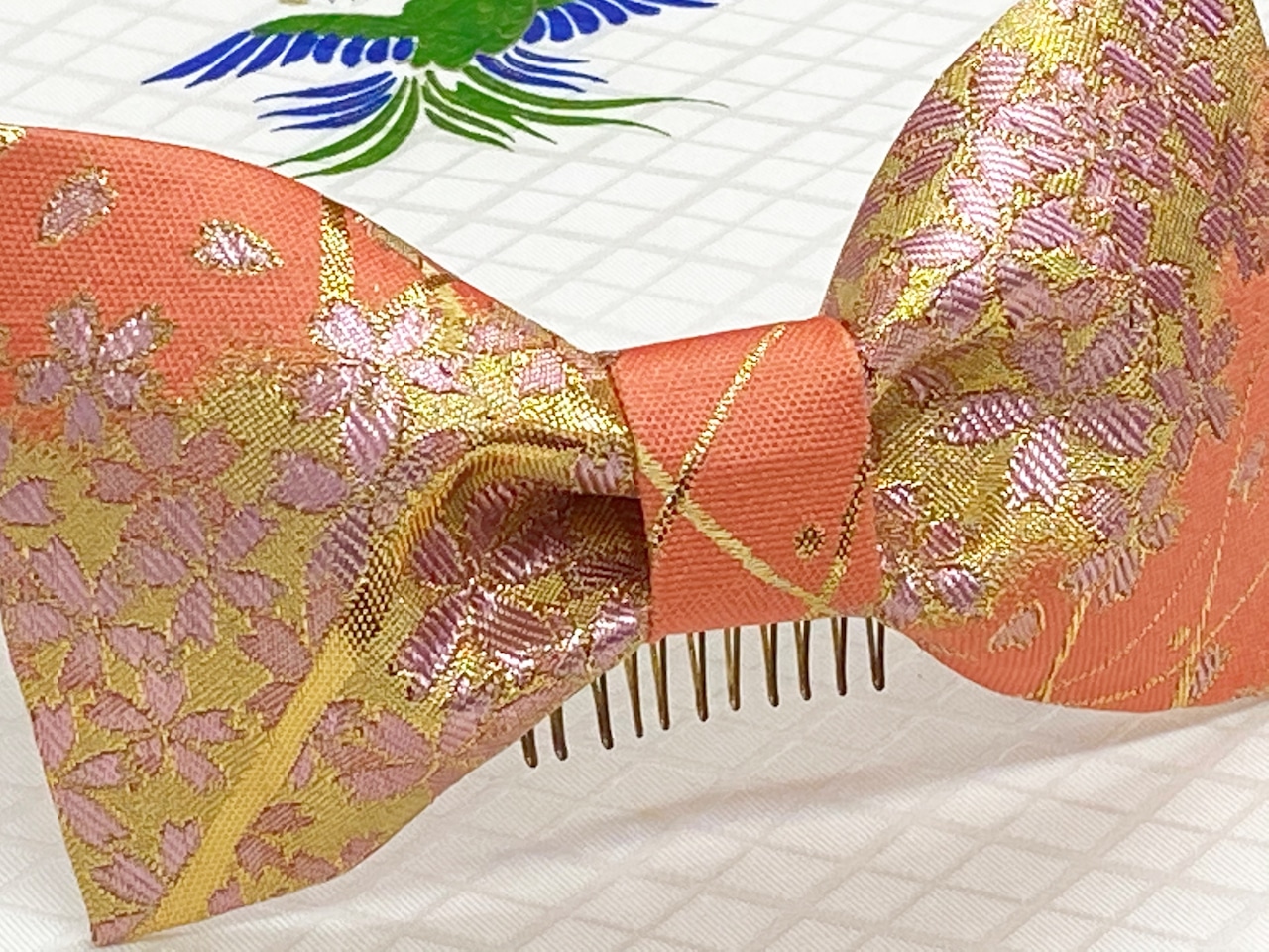 和風リボン○髪飾り○桜柄○サーモンピンク色○m-32 成人式 七五三 結婚式 卒業式 お茶会(送料無料)