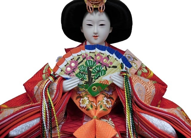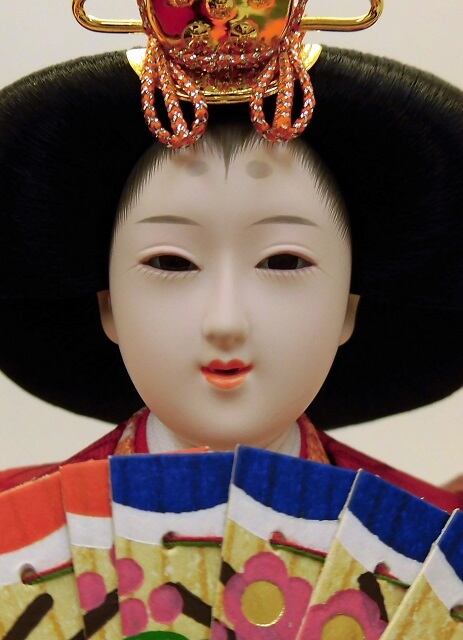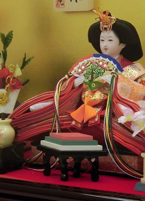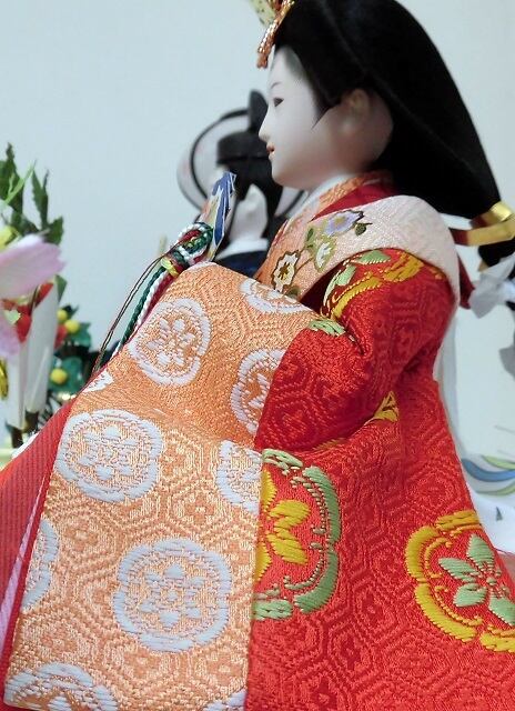 おめでたい吉祥柄のお着物をお召しになられたお雛様です。