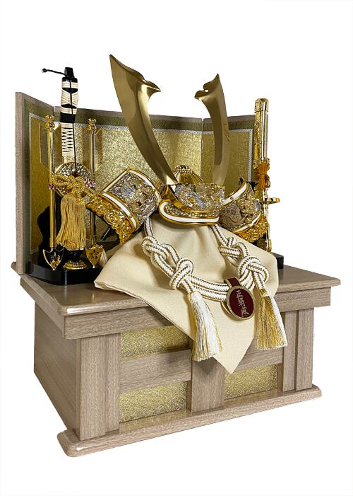 白木風の飾り台とお屏風に水色段縅の兜を合わせた爽やかな色味の収納飾りです。